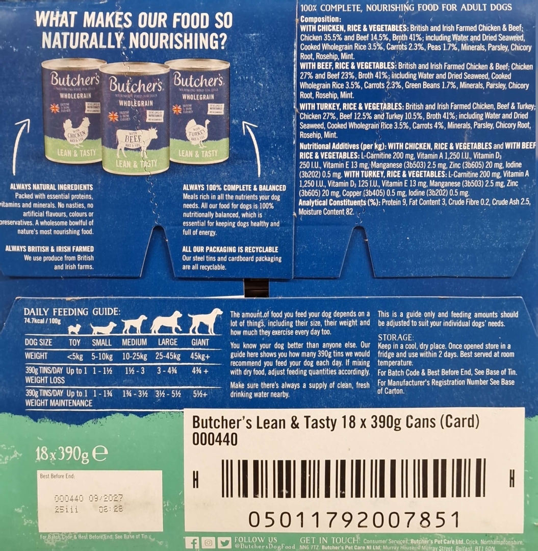 Keep your dog fit and satisfied with Butcher's Wholegrain Lean & Tasty Variety Pack, a nutritious wet food designed to support a healthy weight. Developed by nutritionists and vet recommended, this complete and balanced food provides all the essential nutrients dogs need while containing 20% less fat than standard recipes ideal for dogs with lower activity levels or those needing weight management.