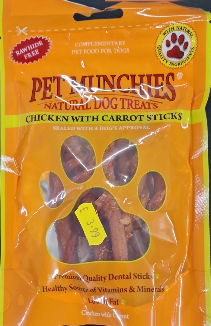 Delight your dog with a tasty and healthy snack Pet Munchies Chicken with Carrot Sticks. Made from premium chicken breast meat wrapped around real carrot sticks, these treats are low in fat, rich in vitamins and minerals, and help promote healthy teeth and gums.